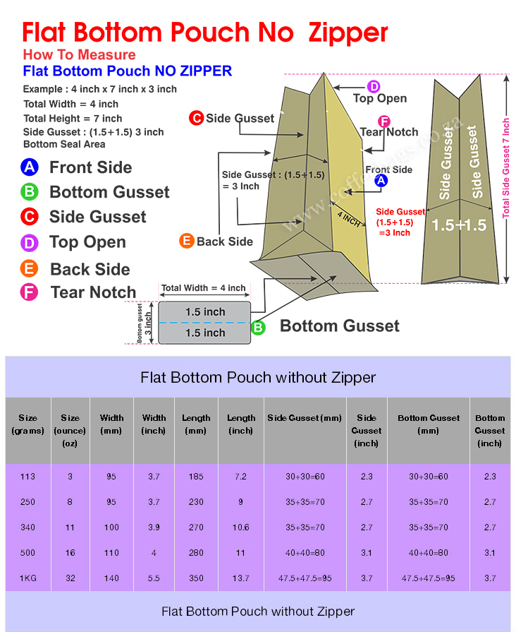 Our exclusive range of flat bottom pouches includes white paper bags without zipper, white paper with tear zipper, kraft paper bags without zipper, kraft paper with tear zipper, matt silver without zipper, matt silver with tear zipper, matt black without zipper, matt black with tear zipper, matt gold with tear zipper etc. The standard dimension what we use to make flat pouches is (4X7X5X5) inches, where 4 inches is the width, 7 inches is the height, 5(2.5+ 2.5)inches is the side gusset and 5(2.5+2.5) inches is bottom gusset.
